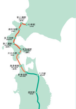 ○駅:奥津軽(仮称)、木古内、新函館(仮称)、八雲、長万部、倶知安、新小樽(仮称)、札幌